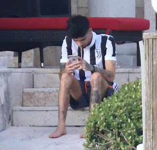 The star also flaunted his intricate tattoo sleeves as he smoked while staring intently at his smartphone.